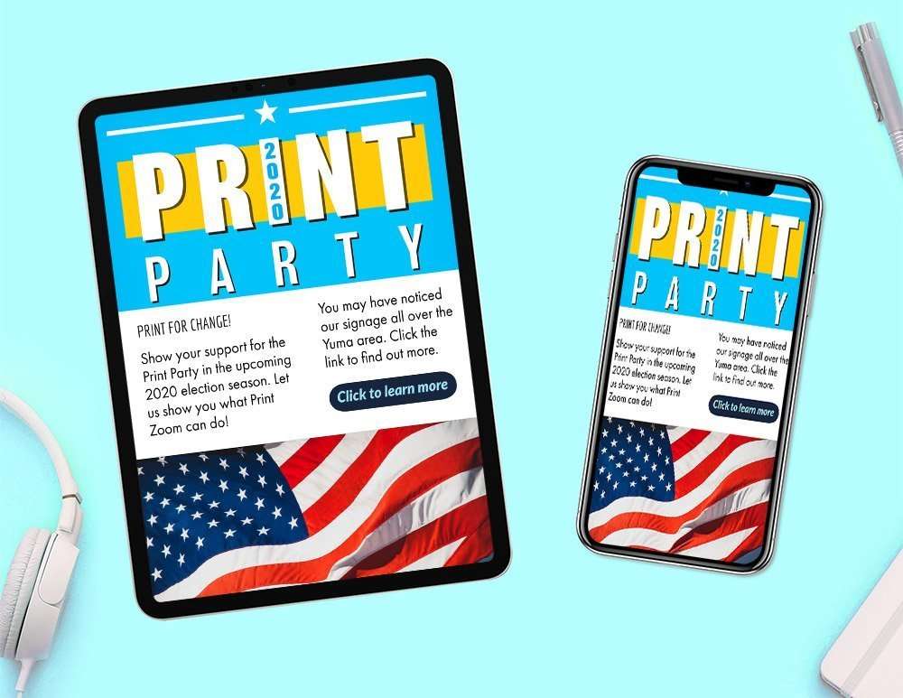2020 is an energetically charged election year and Imaginary Friends Design Studios (IF) and Print Zoom have teamed up for The Print Party Experiment. The Print Party is an imaginary political party that is campaigning for it’s selected candidate. This candidate wants to shine above all others in the upcoming election. How can your Imaginary Friends help this candidate get their name out there and get those votes? IF has come up with a plan for advertising and marketing 4 different areas: outdoor collateral, digital, swag and collateral marketing tools. You don’t have to be a political candidate to benefit from executing any of these free marketing strategies. Any business can improve their reach and visibility by creating a plan and executing these tools.